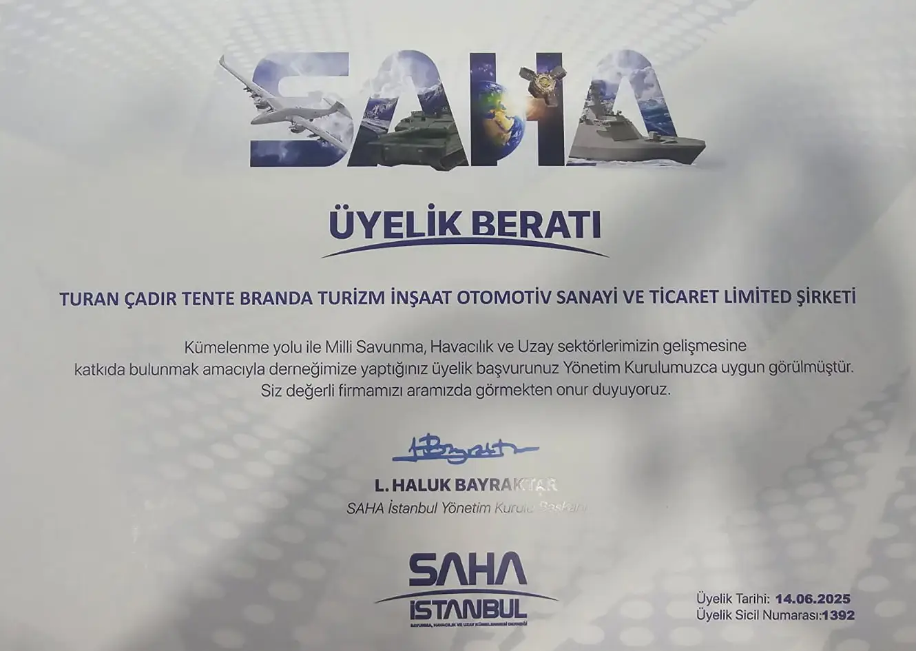 Turan Çadır Tente Branda Turizm İnşaat Otomotiv Sanayi ve Ticaret Ltd. Şti., Türkiye'nin en büyük savunma sanayi kümelenmesi olan SAHA İstanbul’un resmi üyesi oldu. Türkiye'nin yerli ve milli savunma sanayisine katkı sunma vizyonuyla çalışmalarını sürdüren firmamız, 14 Haziran 2025 tarihi itibarıyla SAHA İstanbul ailesine katıldı. Bu üyelik ile birlikte savunma, havacılık ve uzay sanayi alanlarında daha güçlü iş birlikleri ve yenilikçi üretim kabiliyetlerinin geliştirilmesi hedeflenmektedir.